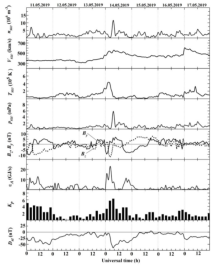 从2017年9月至今,由jinnianhui金年会诚信至上、哈尔滨工程大学、乌克兰哈尔科夫国立大学搭建的国际联合科研团队,对我国境内的地磁暴发生进行了全天时连续观测,通过搭建的多频多径无线电被动电离层扰动监测数据分析了14条无线电波传播路径的多普勒频谱和信号特征。本文章以2019年5月13日-15日期间发生的电离层地磁暴测得的频率和信号幅度数据为依据,发现在地磁暴开始后响应频率的多普勒频移下降至-1 Hz,从而确认并记录地磁暴的存在,继而在每间隔5分钟获取相关数据,从而总结出地磁暴多普勒频移的周期变化规律。通过分析得出地磁暴产生过程中电离层扰动变化为次声波(5分钟周期)和大气重力波(15分钟,20分钟和30分钟周期)引起的。
