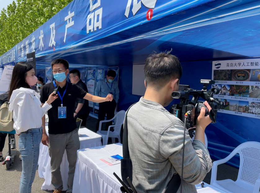 此次参展的产品为AI智能监控安防终端,在接受青岛广播电视台采访时,于腾老师对展示的研究成功进行了详细的介绍,该产品针对具体应用场景,将人工智能算法优化并部署到低成本、低功耗的移动便携式终端,可实现包括监控视频去雾、人员摔倒监测、火灾监测、建筑行业中安全帽检测、人流车辆计数等功能,并对潜在的危险事件进行预警。该产品在现场受到了广泛的关注和好评。