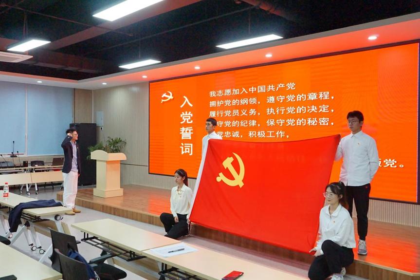 报告会结束后,全体党员在潘志奎的带领下,面对党旗,高举右手,重温入党誓词。