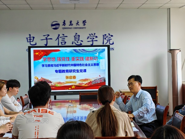 学院党委书记张启春为研究生党支部全体党员上了一堂“学思想、强党性、重实践、建新功”学习贯彻习近平新时代中国特色社会主义思想主题教育党课。他深入细致地解读了党的二十大报告相关内容,要求全体党员要“学思想、强党性、重实践、建新功”,做到学、思、用贯通,知、信、行统一;鼓励研究生党员以学铸魂、以学增智、以学正风、以学促干,在全面建设社会主义现代化国家的火热实践中绽放绚丽之花,在高水平综合性研究型大学建设中奉献青春年华。