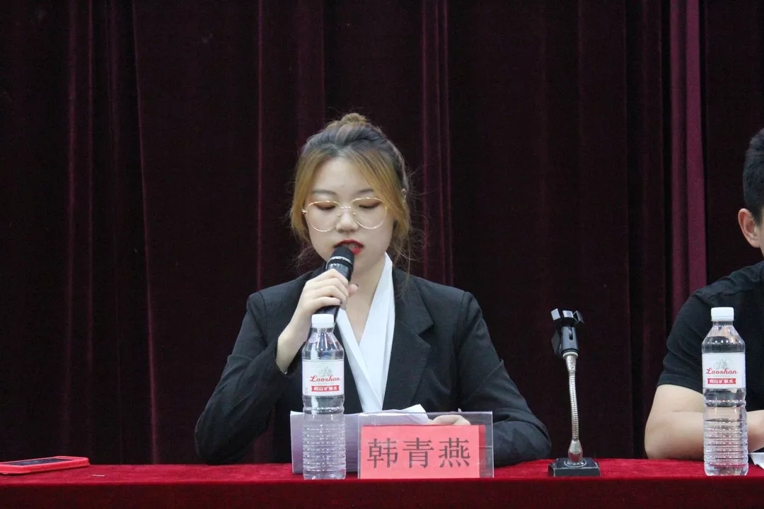 然后,学生会主席韩青燕讲话。韩青燕主席首先对各位老师表达了感谢,对各位学生会新干部表达了欢迎并提出了“不忘初心,砥砺前行”的口号,要求大家有培养集体意识,主人翁意识,要以饱满的热情投入工作中,其次要求大家注意培养团结意识。最后,韩青燕提醒学生会成员们要注意工作,提出了“系统规范,稳重求进,精益求精,开拓创新”的口号,要求大家严格要求自己,牢记责任意识和团结意识并对第四届学生会寄予了厚望。