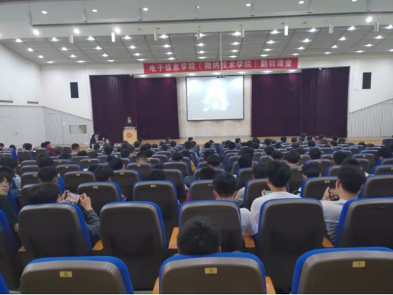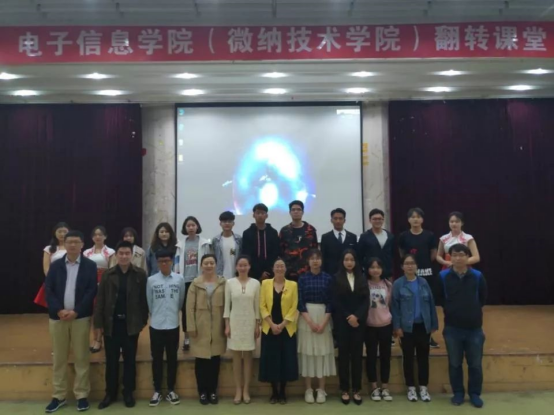 微风习习,天气正好。在纪念五四运动100周年、新中国成立70周年和学校办学110周年之际,电子信息(微纳技术)学院于5月12日晚六点二十分在图文中心四楼举行“翻转课堂之我和我的祖国”专题活动。出席本次活动的嘉宾有学院党委书记苗洪丽老师,18级辅导员徐蕾老师,15、16级辅导员杨国庆老师,电信二班班主任金哲俊老师,电信三班班主任王翠平老师和微纳一二班班主任李元月老师。