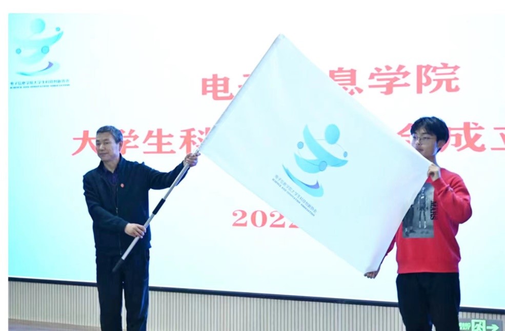 在启动仪式上,刘孝群向金年会官网大学生科技创新协会授旗。