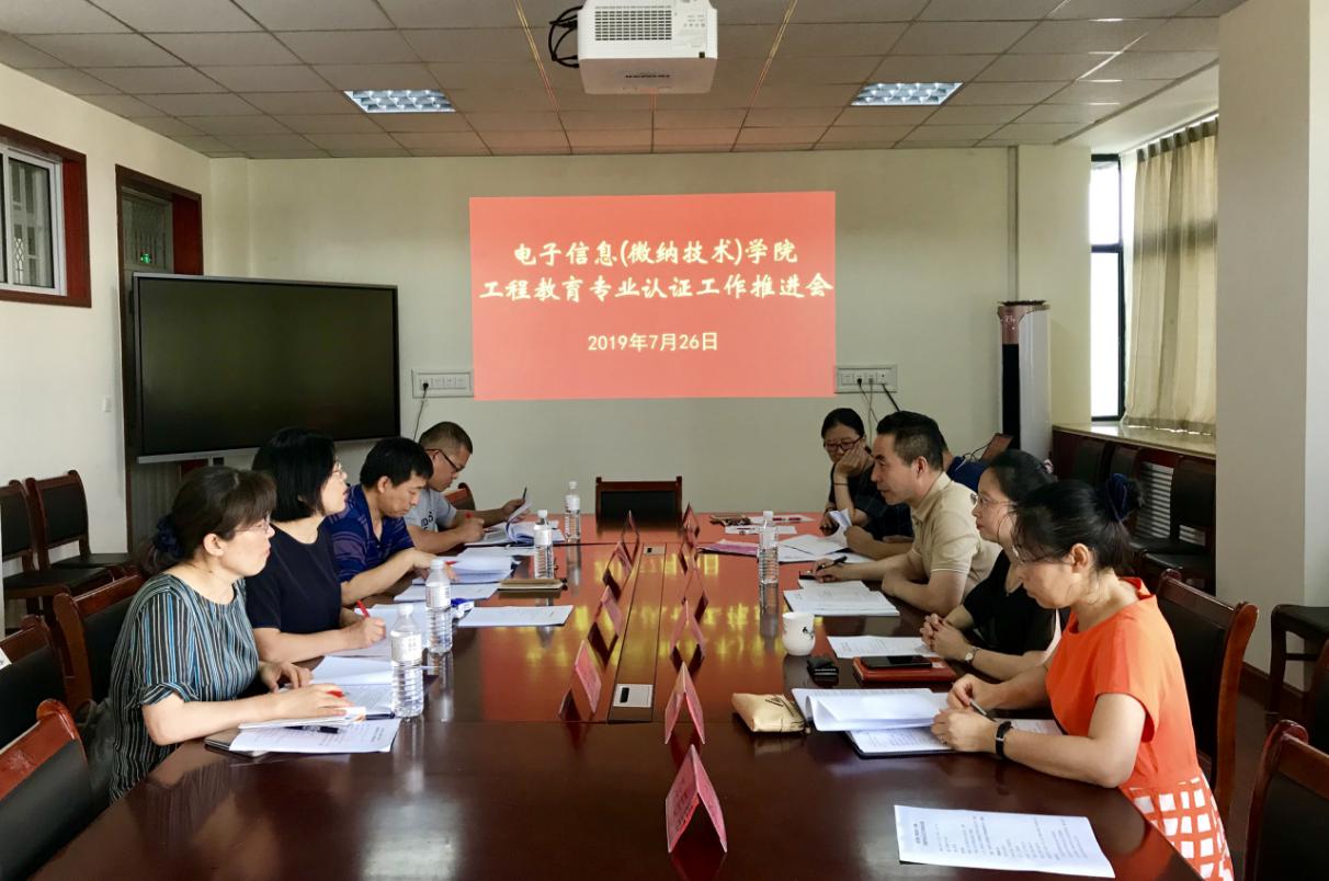 7月26日上午,电子信息(微纳技术)学院在诚思楼407会议室召开工程教育专业认证工作推进会。学院邀请了自动化学院自动化专业负责人潘松峰教授、自动化学院院长助理丁军航副教授、材料科学与工程学院高分子材料与工程系主任王瑶教授、材料科学与工程学院高分子材料基础教研室主任马艳玲副教授参加。学院党委书记苗洪丽主持会议。学院领导班子成员、系主任、副主任、党支部书记及教科办、学工办管理人员参加会议。