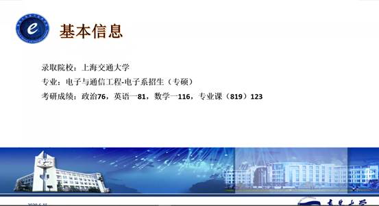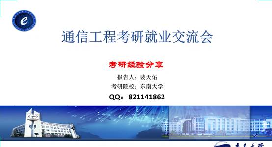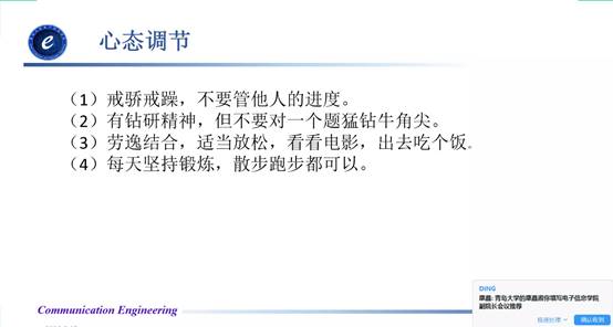 第三位分享人是来自16级通信3班的裴天佑,已成功考研至东南大学。裴天佑也是对考研中的数学、英语、政治和专业课的考研准备分别进行了详细的介绍。针对数学的考研复习,他向同学们推荐了张宇老师的课程。他说到要通过做习题,总结错题,看笔记来进行综合的复习备考。英语复习中,他推荐同学们看朱伟老师的视频,每周一套真题,之后进行专项突破。英语作文可以在网上寻找优质资源,进行学习和背诵。针对政治复习,裴天佑推荐了徐涛老师的讲解视频,并说道一定要做好1000题。最后,裴天佑为同学们送上忠告:一定要注重心态的调节。