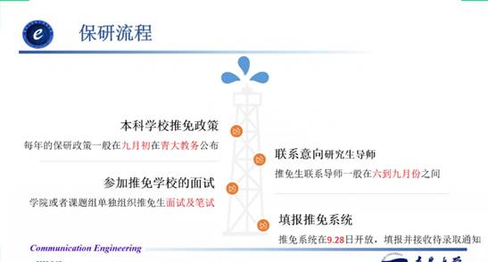 第二位分享人是来自16级通信1班的张吉发,已成功保研到北京航空航天大学。张吉发就保研流程、保研准备和保研时间规划进行了系统的讲解。他指出:想保研的同学,一定要了解本校最新的保研政策,根据要求和需要准备的工作来衡量自己是否适合保研。确定保研的同学,要准备好自己的个人材料,主要包括:个人简历、获奖证书、成绩单、推荐信等。做好资料准备和面试准备。此外,一定要尽早联系好导师,在研究方向的问题上应该多与老师交流沟通。张吉发强调,同学们必须对自己有明确的认识,有足够的兴趣支撑才能在科研的道路上越走越远。