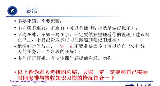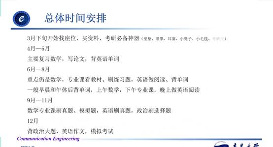 第四位分享人是来自16级通信2班的王庆燃,已成功考研至上海交通大学。王庆燃给出了自己的考研时间规划表,在他的计划表里赫然写道:数学是重点,需要多做真题。另外,对于英语这门语言学科,她说最重要的是坚持学习,同学们应该固定每日英语学习时间,每天坚持,形成习惯。在高数复习中,她建议大家学习张宇老师的课程和习题。专业课的学习上,要认真看教材,重点题认真做,切忌心急。