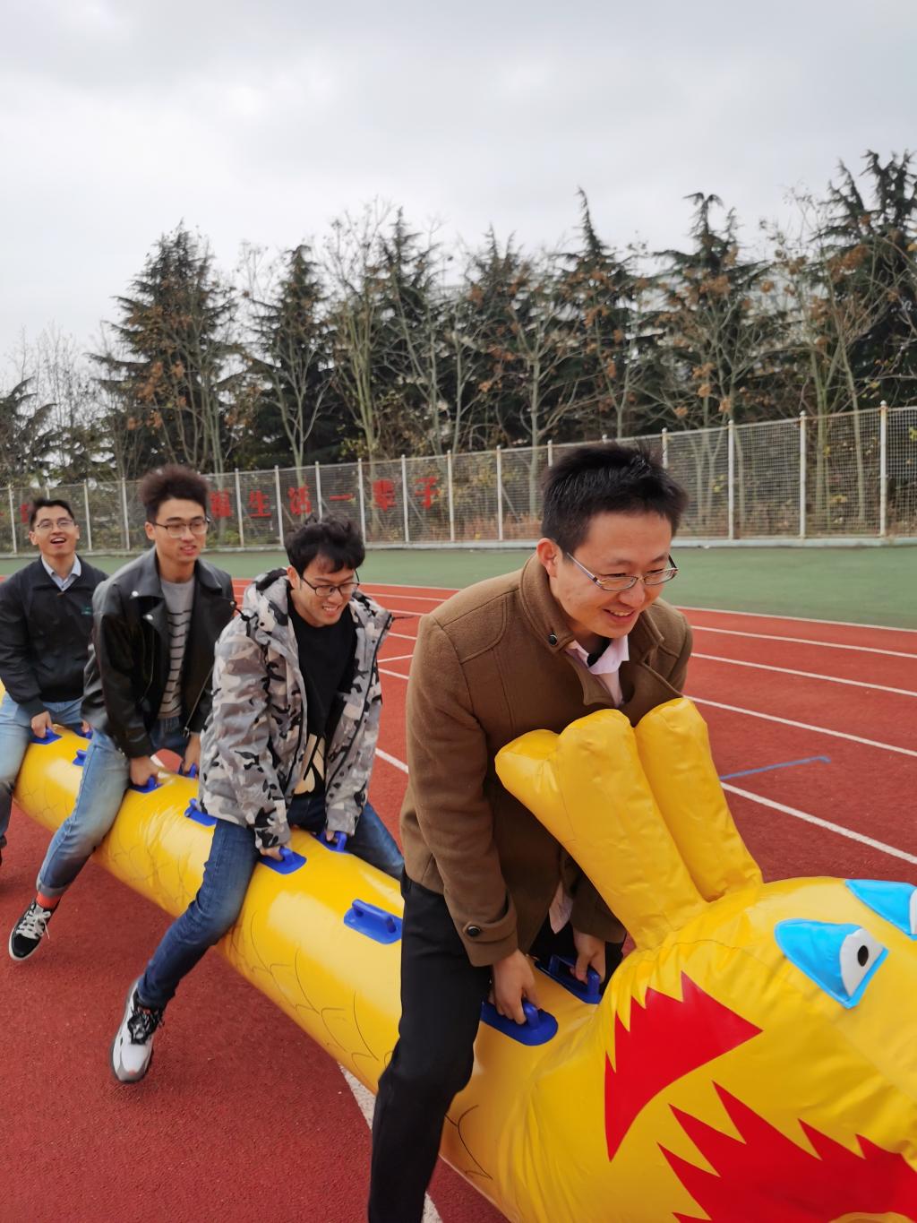 11月19日下午,jinnianhui金年会诚信至上教职工趣味团体赛在西院体育场举行,jinnian金年会工会16位教职工本着“运动,更健康”的精神,在苗洪丽书记的带领下参加了骑长龙和全场运球投篮接力赛两个项目的比赛。