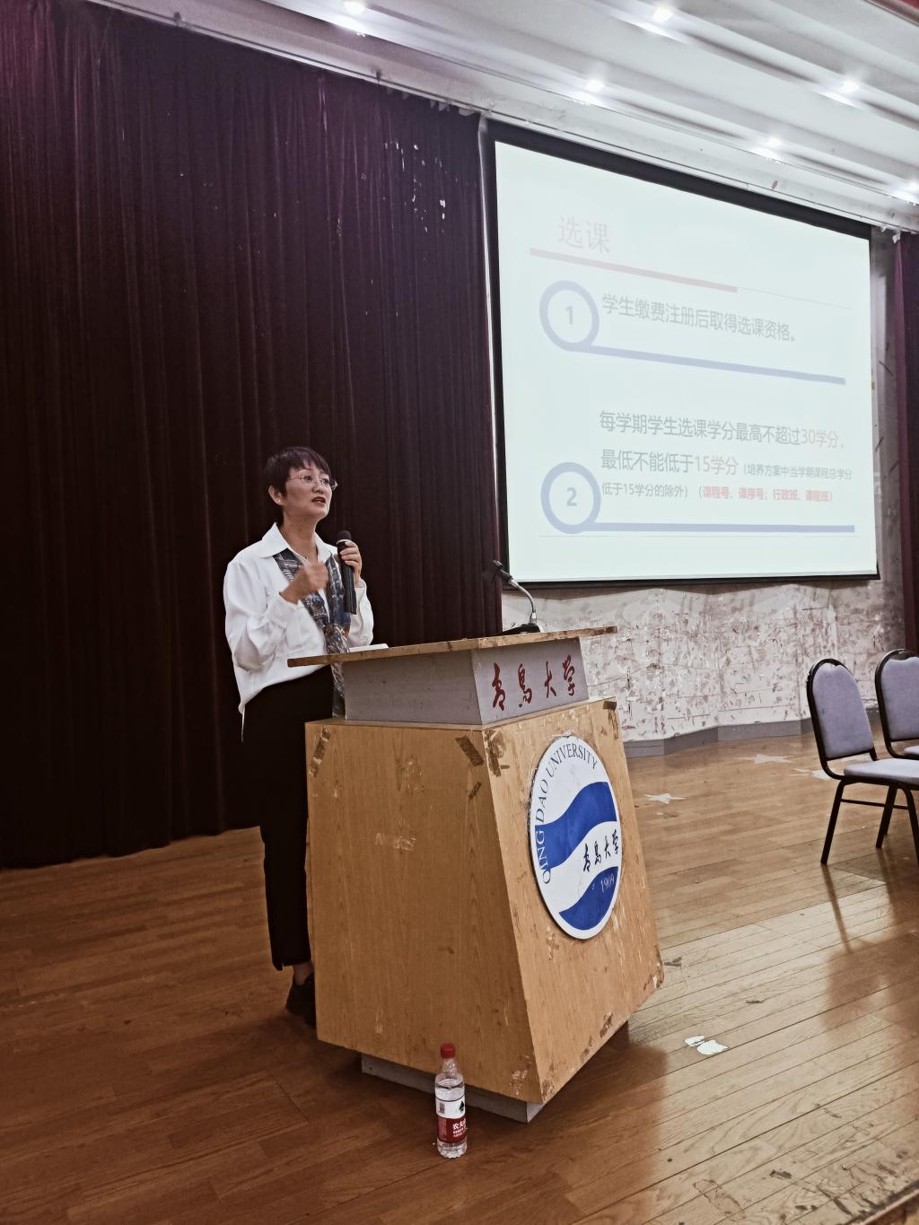 教科办主任科员袁淑萍针对学分制管理给新生做了详细的解读,介绍了学分制概念、主要内容,专业培养方案,学籍管理,选课、重修、免修、辅修专业,课程考核及其中补考、缓考、旷考,以及毕业、结业、肄业的相关内容,使新生对学分制管理有了更深刻的了解。