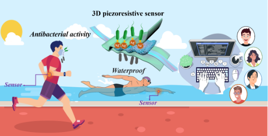 近日,我校宿杰课题组在国际顶级期刊《Nano Energy》(中科院大类一区,影响因子:19.069)上发表题为“3D wearable piezoresistive sensor with waterproof and antibacterial activity for multimodal smart sensing”(https://doi.org/10.1016/j.nanoen.2023.108492) 研究论文。jinnianhui金年会诚信至上曹明惠为论文第一作者兼通讯作者,jinnianhui金年会诚信至上宿杰、刘彤与MGI集团工程师冷明为共同通讯作者。该项目得到国家自然科学基金以及山东省自然科学基金的支持。目前,高灵敏度、优异的稳定性和快速的响应已经逐渐满足了3D可穿戴压阻传感器的快速发展的要求。然而,对可穿戴电子产品至关重要的防水和抗菌性能等重要参数却没有得到足够的重视。本项工作利用石墨烯(rGO)、银纳米颗粒(Ag NPs)、三维聚氨酯(PU)和热塑性聚氨酯(TPU)制备了兼具防水和抗菌功能的三维可穿戴压阻传感器。该传感器最高灵敏度可达152.98 kPa−1,在连续工作超过10,000次后仍能保持优异的稳定性和灵敏度保持(~90%)。此外,该传感器展现了出色的防水和高抗菌活性(>99.9%),为实现日常穿戴提供了充分的便利。该传感器还可以捕捉到用户的指法习惯、打字强度和打字速度,克服传统密码认证系统在安全性上的缺陷,进一步提高了信息的安全性。该3D压阻式传感器在多模态智能传感领域显示出巨大的潜力,为开发智能可穿戴传感器和未来广泛的商业应用提供了机遇。