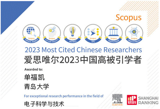 2024年3月27日,爱思唯尔(Elsevier)正式发布2023“中国高被引学者”(Highly Cited Chinese Researchers)榜单,金年会官网单福凯教授入选电子科学与技术学科榜单,这也是单福凯教授连续第三次入选高被引学者榜单。