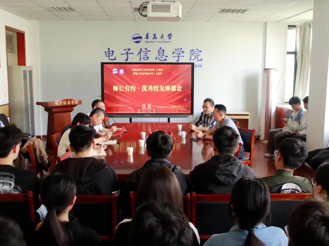 5月13日上午9点,jinnian金年会在诚思楼407会议室举办“师长有约”优秀校友座谈会。座谈会邀请了金年会官网三位优秀校友——1994级应用电子技术专业高明辉和1995级赵龙以及2005级电子通信工程专业校友王灿与50余名在校学生进行了交流分享。学院党委副书记刘孝群、通信工程专业许丽艳老师、电子信息工程专业于瑞涛老师出席本次活动。座谈会由于瑞涛老师主持。