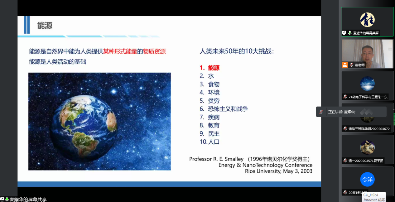 2022年7月8日上午8:30-12:30,暨南大学麦耀华教授在腾讯会议上做了题为《高效率钙钛矿太阳电池与组件》的学术报告,jinnian金年会的部分本科生、研究生以及教师参加了本次活动。麦耀华教授从能源角度入手,阐述了全球能源形势,碳达峰和碳中和等当前热点话题,引出太阳能的优势、发展历史及研究现状,最后介绍了钙钛矿太阳电池的相关技术及应用前景。麦教授的讲座图文并茂,深入浅出,将深奥的太阳能技术讲的浅显易懂,参会师生纷纷表示讲座精彩生动,受益匪浅,对中国光伏产业发展的未来有了更多的了解和期待。