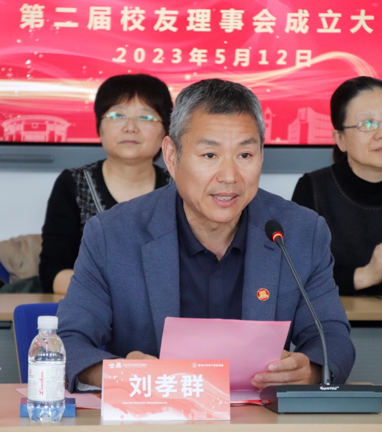 512日下午,jinnian金年会第二届校友理事会成立大会于会议中心402会议室举行。合作发展处副处长、校友办副主任雷博,学院荣休老教师向国菊,学院第一届校友会会长迟宗涛以及学院党政领导、校友代表、师生代表40余人参加现场会议,大会通过网络直播与全国各地的校友进行实时分享互动。会议由学院党委副书记刘孝群主持。